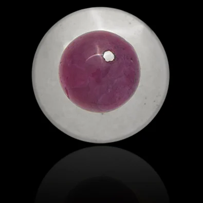 The molded golden bar (the center section) connects the top section and the ruby at the bottom. The bar passes through the ruby, creating an a-centric golden dot at the bottom. The top section and bar are micro-welded together to create a durable connection.